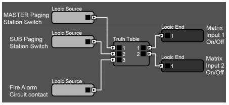 In the Logic configuration, the two paging buttons and fire alarm contact have been linked to three Logic Sources. The Matrix Router On/Off crosspoint parameters have been linked to Logic Ends. The Truth Table has been programmed to produce the appropriate output states taking into account all the possible input state combinations as shown below.