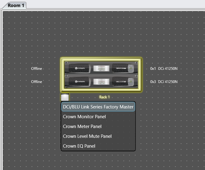 Note: There are different master panels for BLU Link and Dante amplifiers. BLU Link amplifiers in the rack will be controlled by the BLU Link master panel. Dante amplifiers in the rack will be controlled by the Dante master panel.